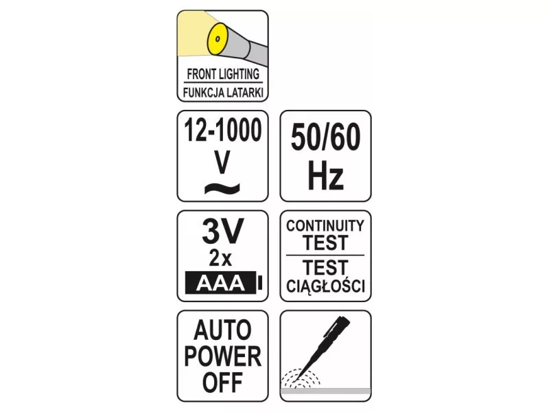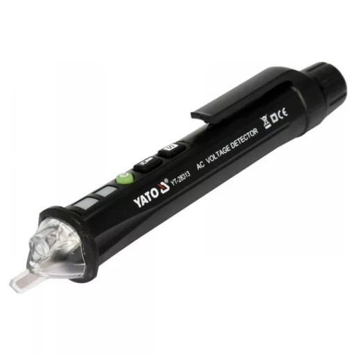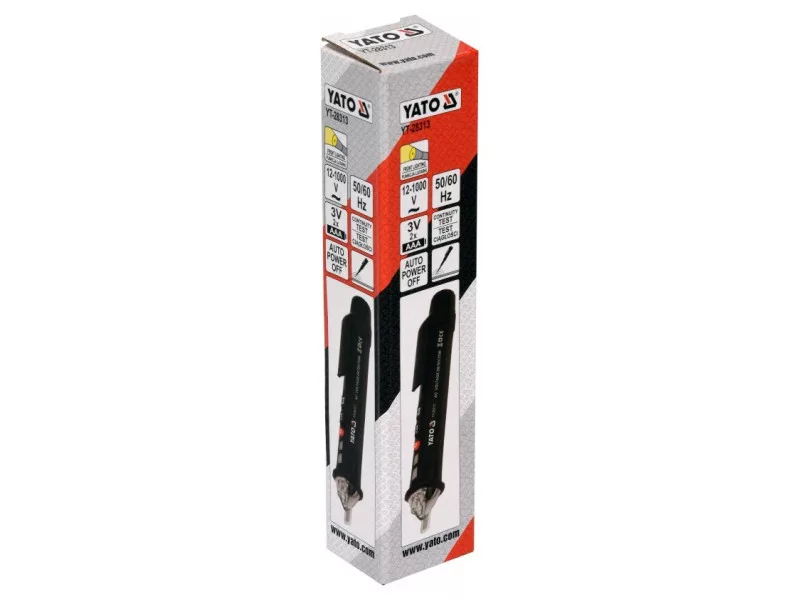 Inductive voltage próbnik YT-28313 enables detection of alternating voltage in electric wires in two ranges of 48-1000V and 12-1000V, as well as detection of a break in a live wire. The elimination of direct contact between the blade and the isolated wire increases the safety of use. Voltage detection is indicated by an LED and an audible signal.
