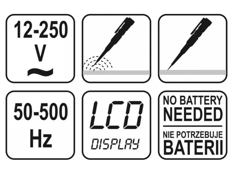 - AC voltage detection by contact method: 12 - 250V