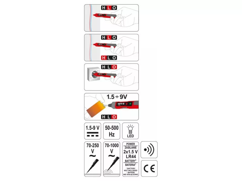 Set the tester to the [O] position. Then, touching the contact located on the side of the handle, apply the tester blade to the battery terminal marked „+”, and with the other hand touch the battery terminal marked „-”. If the LED lights up, it means that there is still voltage in the battery. The tester allows you to check the condition of batteries or rechargeableós designed to power a variety of electrical devices in the range of 1.5V to 9V. Do not use this method to check batteries or rechargeableós with higher voltage ratings. Do not test batteries or rechargeableós connected to an electrical circuit.