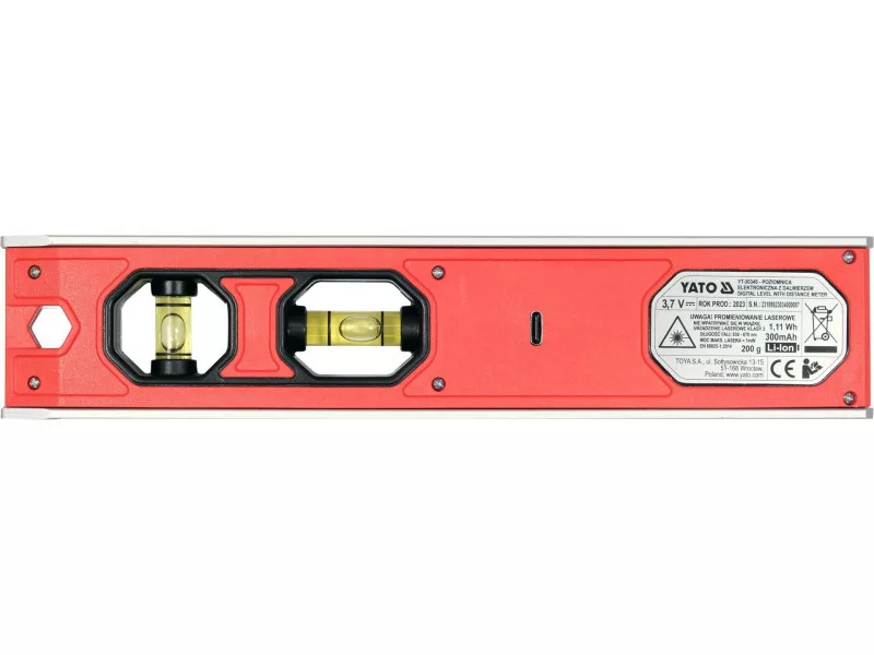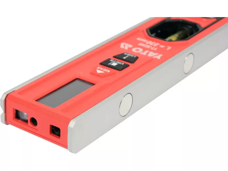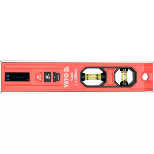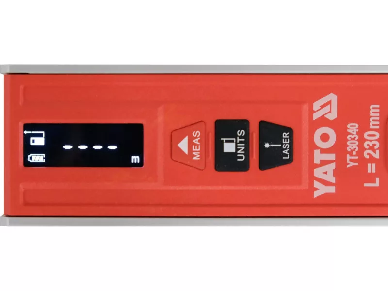 Electronic torpedo level 230 mm with laser for distance measurement and horizontal or vertical line determination. The rangefinder can operate in stationary or dynamic mode (changing distance during measurement). Can be measured from the front or rear edge. The results are displayed on the LCD screen. A groove (prism) is cut into the upper plane of the housing. The spirit level has two glass vials that can be illuminated independently of each other. There are 3 strong magnets mounted in the base. Body made of aluminium section, housing made of ABS.