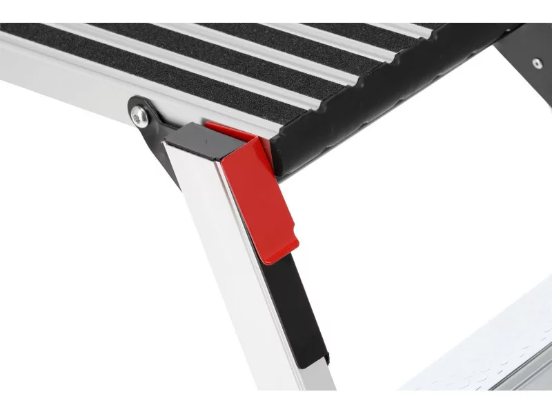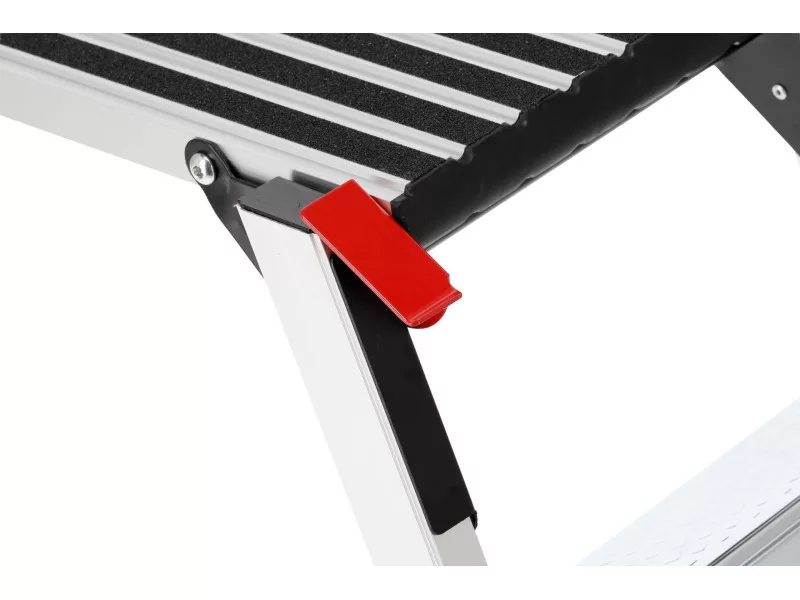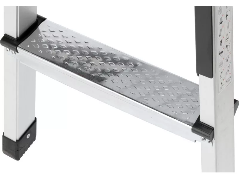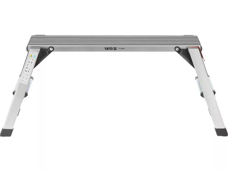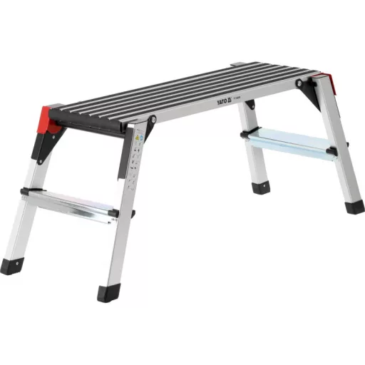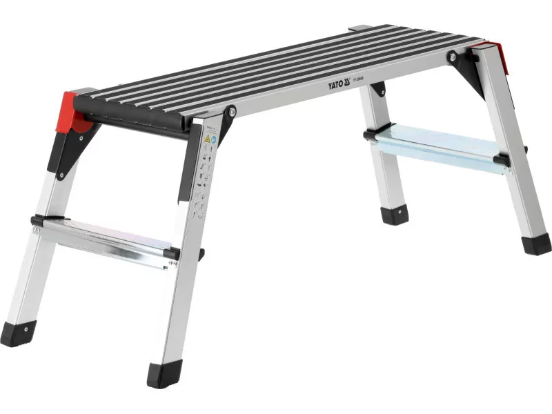 Folding work platform made of aluminium profiles. For safety of use, the platform is covered with non-slip slats and the steps are embossed. Convenience of unfolding is provided by large locking latches.