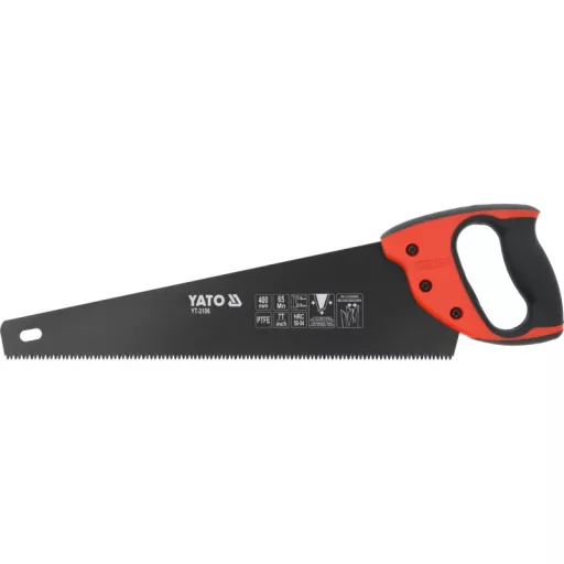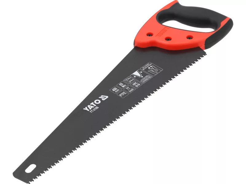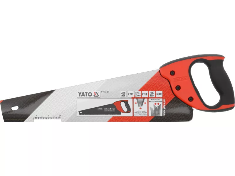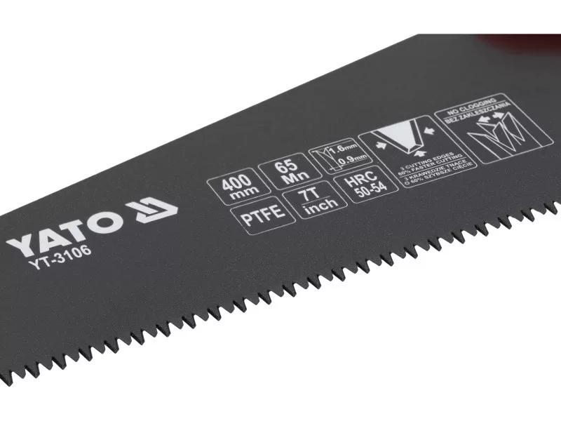 Wood cutting saw and wood -based materials such as plywood, chipboard, MDF plates. The blade made of manganese steel with the symbol MN65, resistant to abrasion and deformation, covered with PTFE coating / chemical name Teflon / reduction to a minimum friction. Saw teeth with a special three -sided profile are adapted for aggressive cutting in both directions. In addition, teeth hardened to 50-54 HRC. Division 7 TPI. The handle is closed, made of plastic.