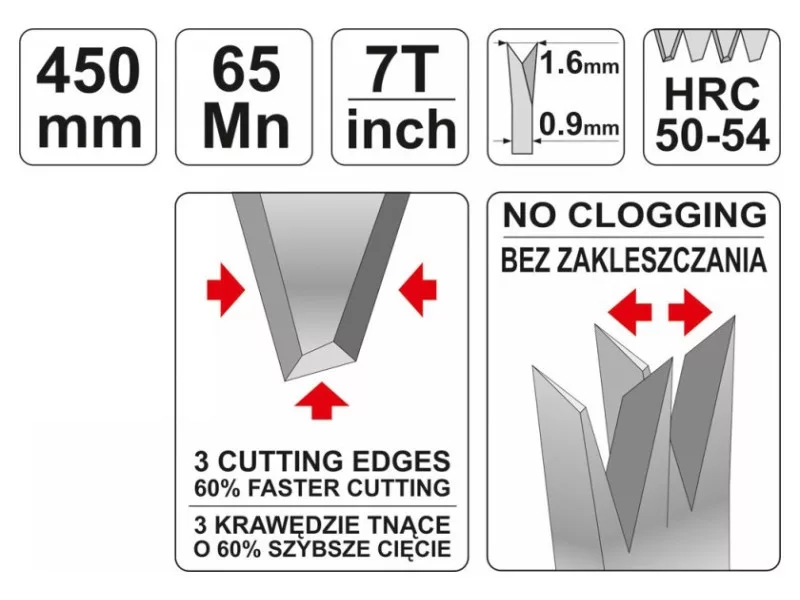 • Aggressive cutting in both directions thanks to the special tri-edge tooth profile