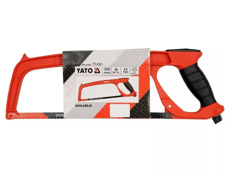 Frame frame for metal l 300 mm, made of pressure cast aluminum. Thanks to a special profile and embossing, extremely light and stiff. The handle closed with polypropylene handle, protects the operator's hand against accidental injury. Effective blade tension with a knob at the bottom of the handle. The surface is covered with plastic. Includes a 300 x 12 mm bimetal blade, 24 TPI. For cutting rods, tubes, angles and other elements made of steel and colored metals.