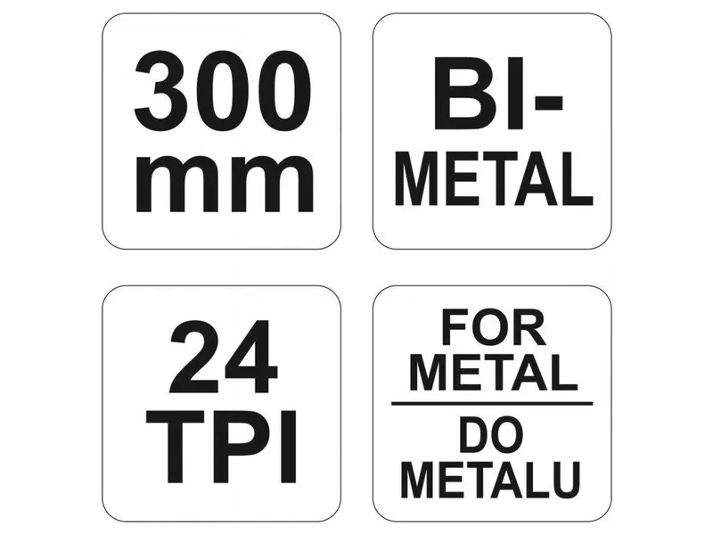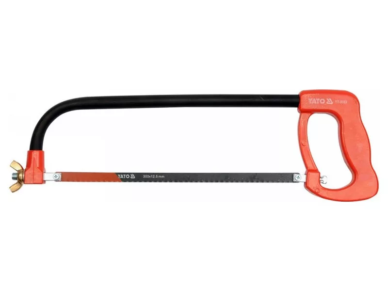 Metal saw L 300 mm, made of steel tube with a safe, closed, aluminum handle. Stressing the blade with a screw with a butterfly nut. Included one -sided 300 x 12 mm bimette blade, 24 TPI scale.