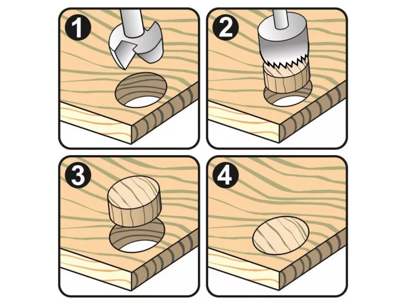 Professional drill bit designed for carpentry and joinery work using a table or hand drill. It allows you to cut holesóin wood and wood-based materials, as well as to remove knotsóin and other defectsóin and mask them with plugs. Useful, for example, when making grooves for hingeóboxes.