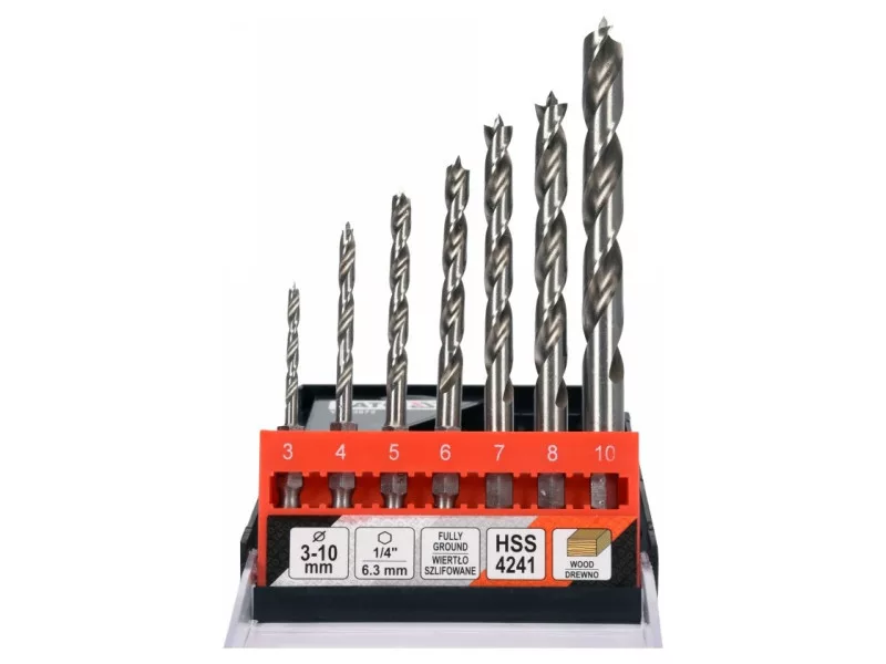 Set of spiral wood drill bits designed for professional use. Useful for drilling in soft and hard wood, plywood and chipboard, carpentry and wood fiberboard.