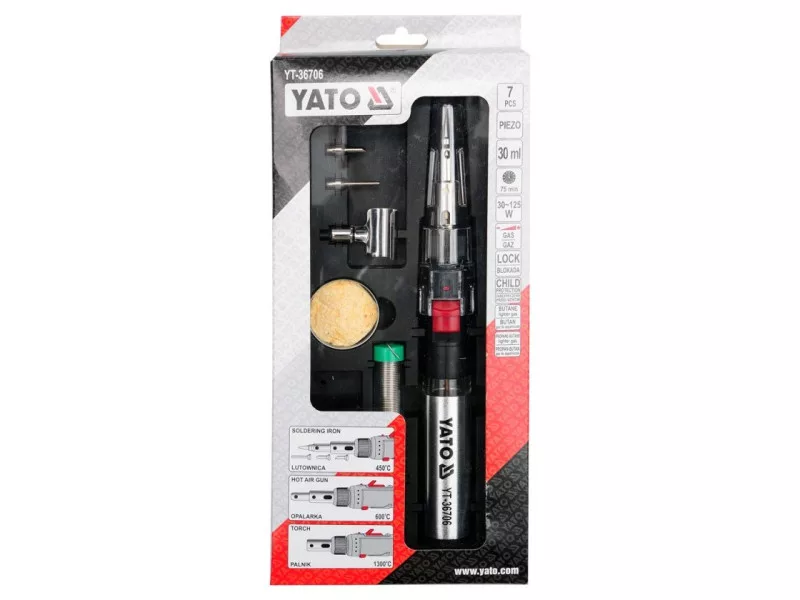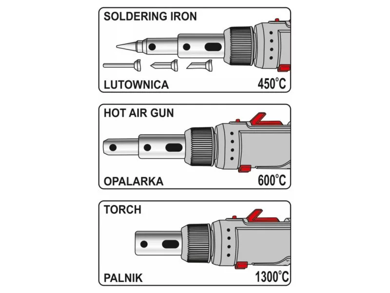 - has the function of soldering iron (max temp 450º c), tanning iron (max temp 600º c) and torch (max temp 1300º c)