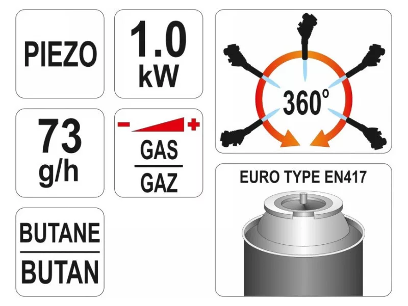• Power supply: Propane-butane gas from an external cylinder (EN417 connector)