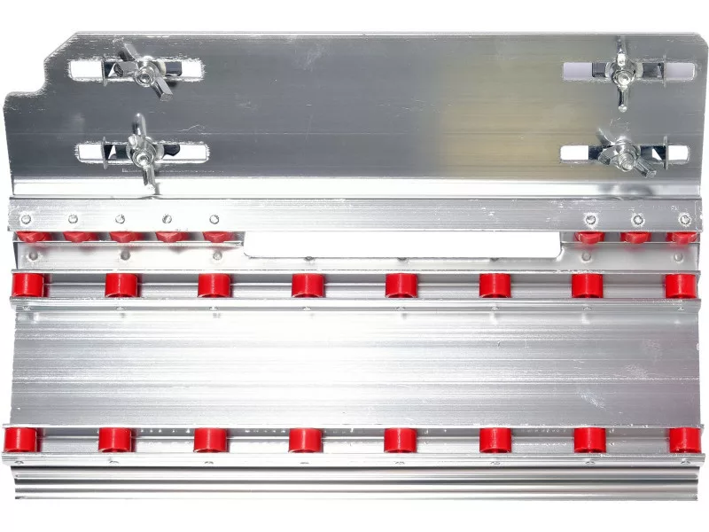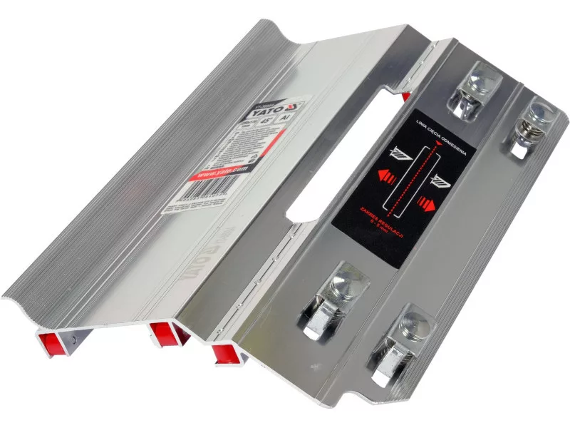 The body of the guide is made of aluminum and equipped with plastic rollers to facilitate smooth sliding on the beveled tile.
