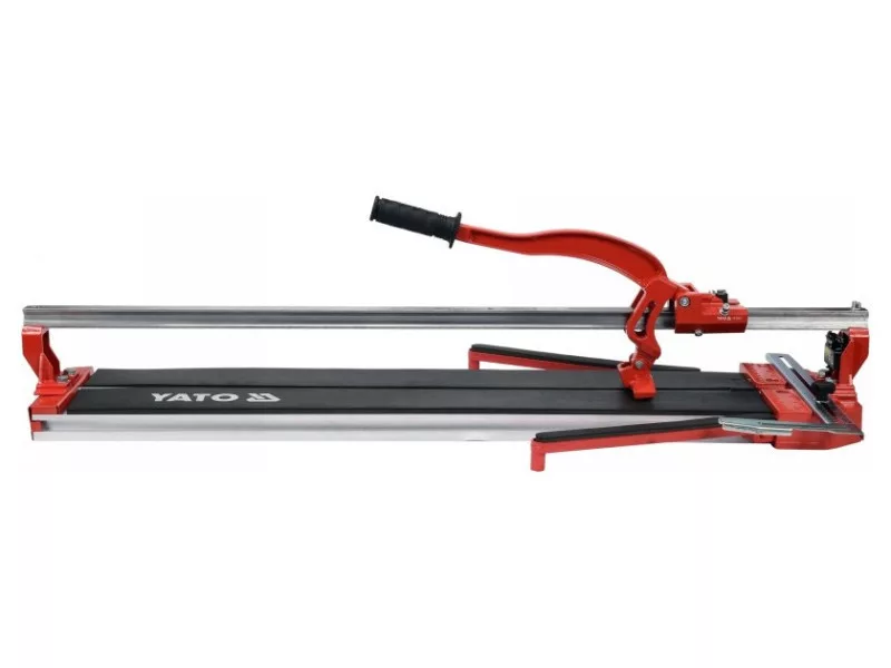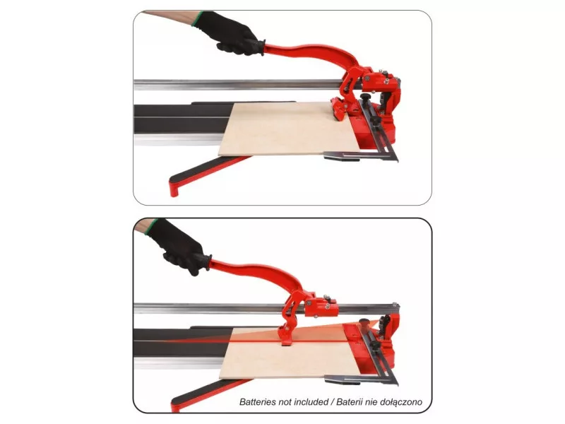 Cutting machine with laser pointer, designed for ceramic tiles with a maximum length of 800 mm. The stable base of the device is made of aluminum. The combined cutting knife and effective breaker move on a single steel guide /breaker unit bearing/.
