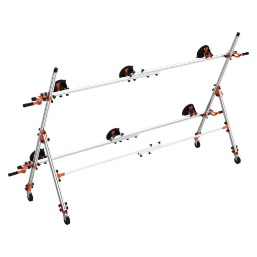 A solid and versatile transport handle designed for safe and stable handling of large-format sheets, both during transportation and material placement at the installation site. The system's construction is based on two aluminum alloy guides, extendable in the range of 160-360 cm, and six durable vacuum suction cups, whose mounting points can be precisely adjusted depending on the shape of the material, ensuring excellent load-bearing capacity and reliability at the workstation.