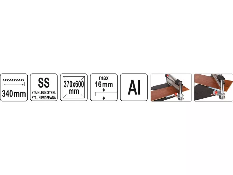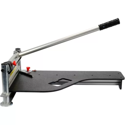 Gilotine for cutting floor panels, cutting width 340 mm, max. The thickness of the cut material is 16 mm. The guillotine knife is embedded in aluminum profiles, fastened on vertical, steel pedestals. The pressure arm is about 600 mm long, the worktop made of hard, wear -resistant plastic has dimensions of 370 mm x 600 mm. Attention, the guillotine knife is extremely sharp and care should be taken. A guillotine for cutting floor panels and other similar finishing materials up to 16 mm thick. Place the processed material on the top of the device, between the plugs fastening the knife. Then, pressing the levers to leave the blade on the material and pressing the desired fragment. Due to the exceptional sharpness of the knife, special attention should be paid during operation.