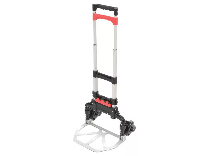 Lightweight, portable, foldable warehouse trolley is suitable for transporting items up stairs. When folded, it takes up little space, making it easier to maintain order. TPR wheels do not damage the surface the trolley moves on. The trolley platform is made of aluminum, making it lightweight and durable. The extendable handle has guides to facilitate the placement of securing rubbers so that they do not slide. There is a lock on the handle guides that stabilizes the transported crates. The lock can be adjusted for crates of different heights. The handle is finished with a comfortable plastic grip. The set includes securing rubbers.