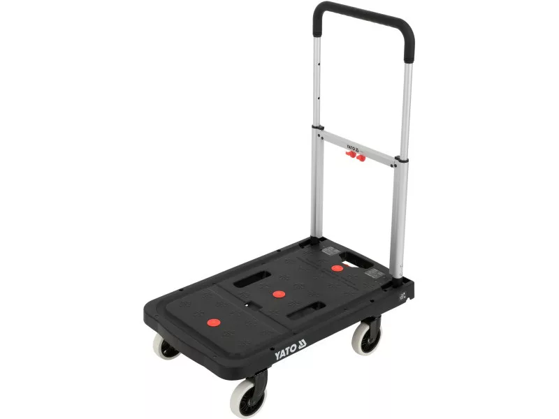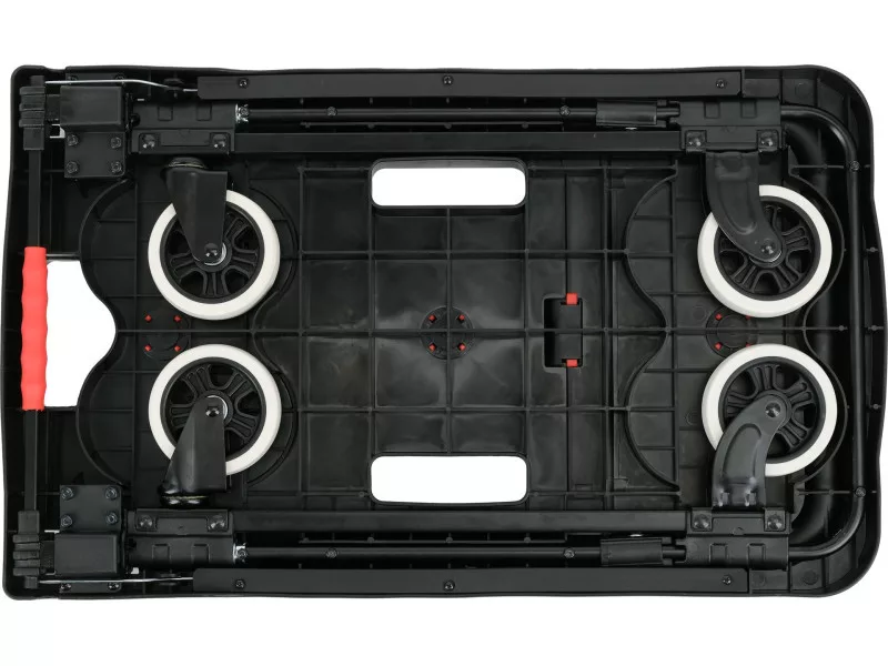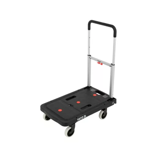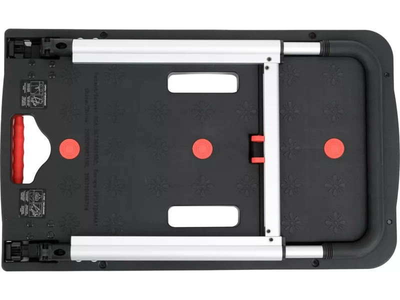 The extendable handle made of durable TPR material provides a comfortable grip and user comfort. The trolley can be folded into compact dimensions of 41 x 8.4 x 67.5 cm, making it easier to store in a workshop, warehouse, or car. When unfolded, it reaches dimensions of 67.5 x 41 x 92 cm, offering a stable and comfortable transport surface.