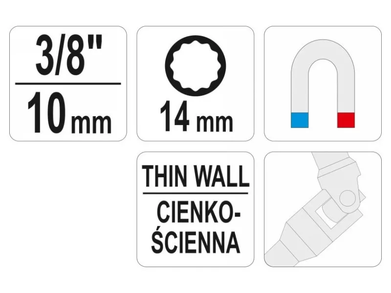 Spark plug caps with the joint. Drive size 3/8 "Patty size 14mm - 12 angle. Cares of the thin -walled inside is a magnet holding a candle.