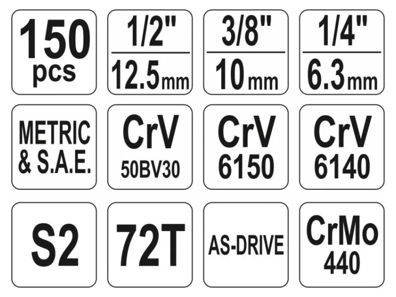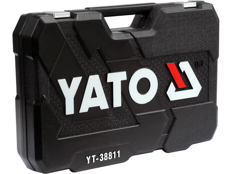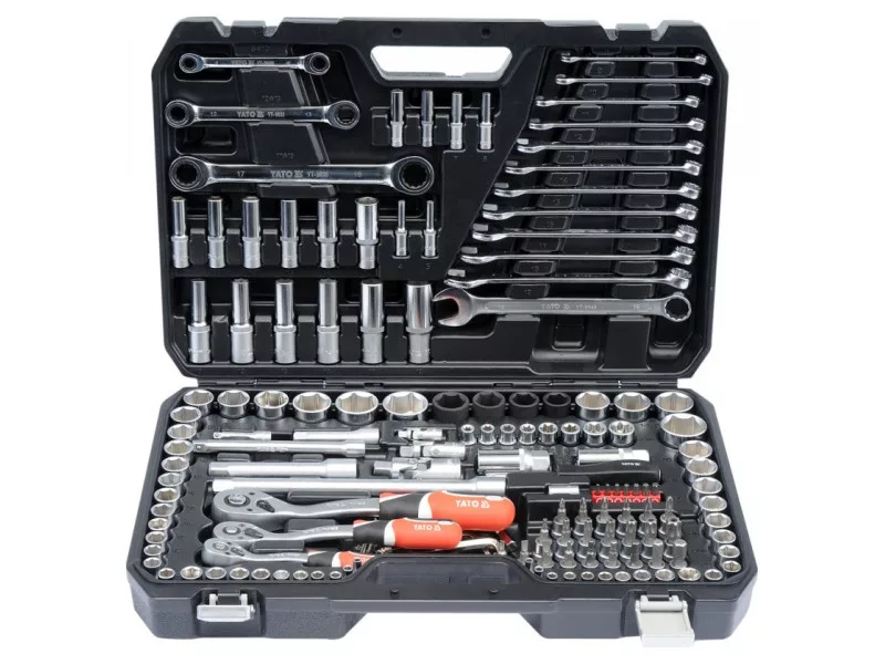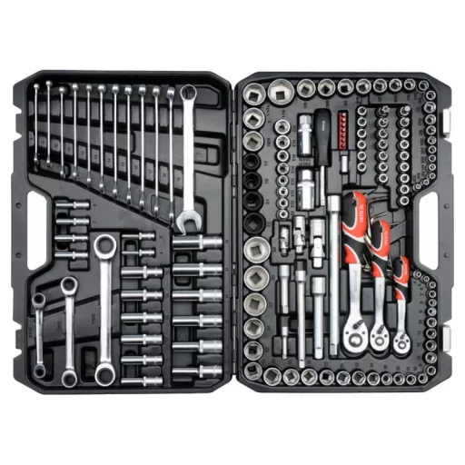 A professional tool set, which was developed for the needs of specialized car and mechanical services. The socket wrenches and the drive of the attachment were made of durable, tool-vanadium steel CRV 50BV3. The attachments were made using the matrix method, and before the hardening process they were calibrated with precise fittings and control devices. The attachments equipped with the AS-Drive system, increasing the maximum moment by 25%, with full protection of the cutter of the caps, the attachment with a two-tone surface finish. The kit also includes bits made of hard S2 steel. The set enables work that requires very high loads and precision, allows you to perform many service activities related to unscrewing and screwing threaded connections of various nominal sizes. Ratches have a triangular handle and 72 teeth (5 degrees working stroke). 1/2 "attachments: 20; 21; 22; 24 mm, l = 38 mm, 27; 30; 32 mm, l = 42 mm caps ½" 17; 19; 21; 23mm long caps 1/2 ": 10; 12; 13; 14; 17; 19 mm, l = 76 mm 1/2 "caps: 15/16"; 1 ""; 1-1/16 "; 1-1/4" "" 3/8 "attachment: 9, 10; 11; 12; 13; 14; 15; 16 mm, L = 28 mm; 17; 18; 19 mm, l = 30 mm long 3/8 ": 10; 11; 12; 13; 14; 15 mm, l = 63 mm 3/8" caps: 3/8 ""; 7/16 ""; 1/2 ""; 9/16 ""; 5/8 ""; 11/16 ""; 3/4 ""; 13/16 ""; 7/8 "" caps 3/8 "TORX: E8; E10; E11; E12; E14; E16; E18; E20 Pods 1/4": 4; 5; 6; 7; 8; 9; 10; 11; 12; 13 mm, L = 25 mm long 1/4 ": 4; 5; 6; 7; 8; 9 mm, l = 50 mm caps 1/4" inch: 5/32 ""; 3/16 ""; 7/32 ""; 1/4 ""; 9/32 ""; 5/16 ""; 11/32 ""; 3/8 ""; 7/16 ""; 1/2 ""; Ratrotka 1/2 ": 72t, 255 mm ratchet 3/8": 72t, 200 mm ratchet 1/4 ": 72t, 155 mm screwdriver knob 1/4", 150 mm extension 1/2 ": 127 mm; 254 mm 3/8 "extensions: 76 mm; 152.4 mm 1/4 "extensions: 50.8 mm 3/8 candle caps: 16; 21 mm Cardana joint: 1/2 "; 3/8" "and 1/4" "" Bitts of bits 1/4 "TORX: T10; T15; T20; T25; T27; T30; T40 TORX screw tips on the 3/8 "attachment: T20; T30; T40; T45; T50; T55; T60 Philips screwdrivers on the 3/8": PH1; PH2 PH3 Cross -screw tips on the 3/8 "switch: PZ1; PZ2, PZ3 Flat screwdriver on the 3/8": 4, 5.5; 6.5 mm hexagonal screwdriver on the 3/8 ": 3; 4; 5; 6; 6, 10 mm Muscular keys: 8; 9; 10; 11; 12; 13; 14; 15; 16; 17; 18; 19 mm eyelets with a ratchet: 8x10; 12x13; 17x19 mm Allen keys: 1.5; 2; 2.5; 3; 4; 5; 6; 7; 8; 8; 10 mm
