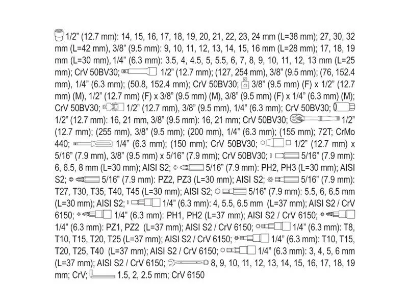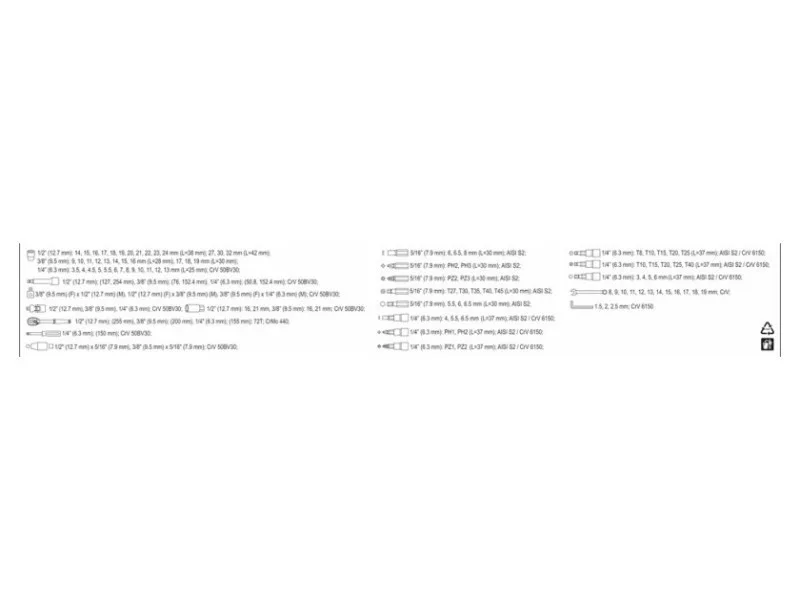 • Tool handle size: 1/4" (6.3 mm), 3/8" (9.5 mm), 1/2" (12.7 mm)