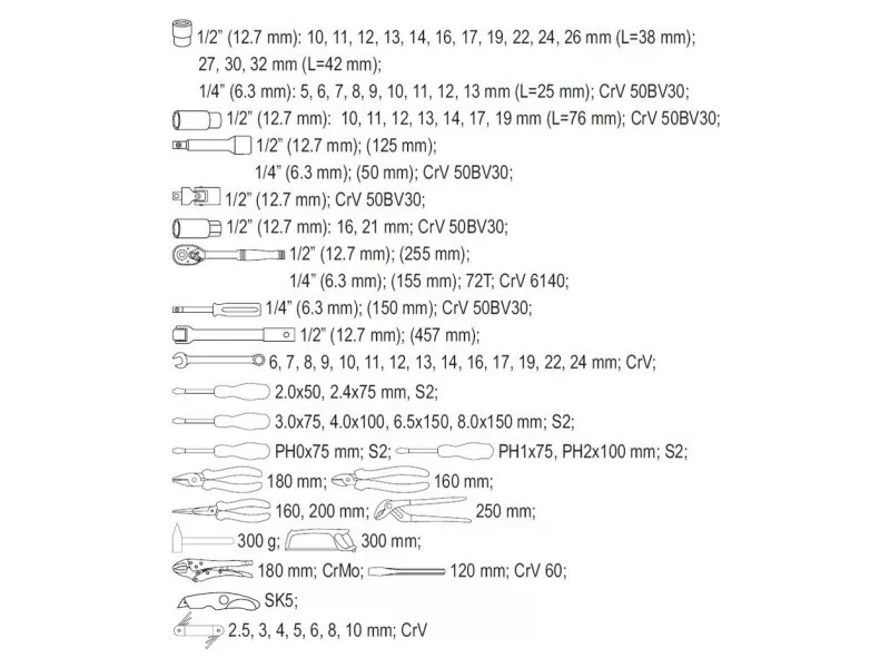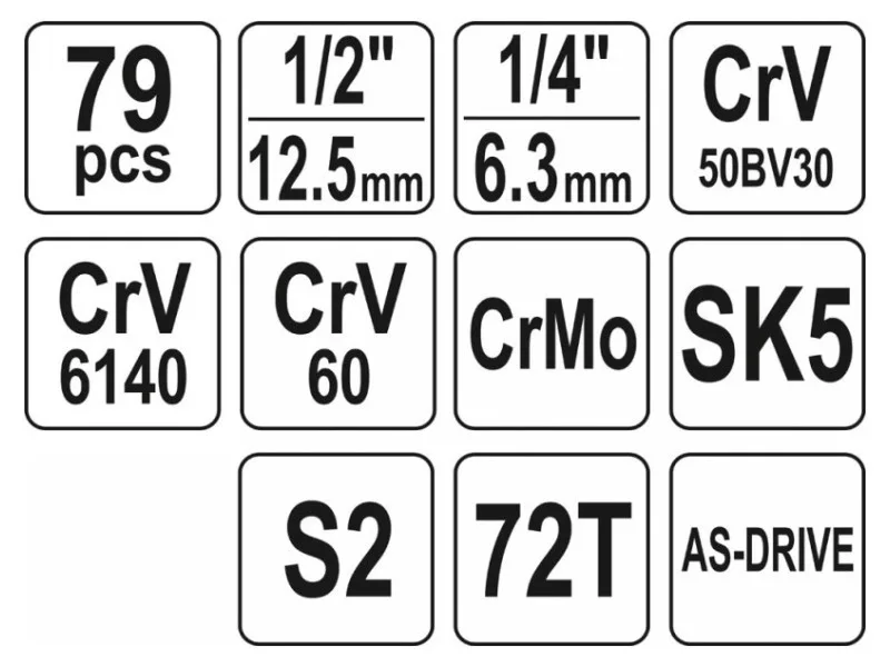 A professional 79-piece tool set designed for the needs of specialized automotive and mechanical service centers. The socket wrenches and drive sockets are made of durable, tool-grade chrome-vanadium steel CrV.