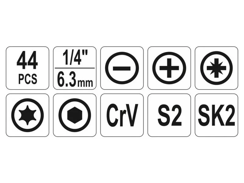 - Phillips 1/4” (6.3 mm): PH1, PH2, PH3 (L=25 mm)