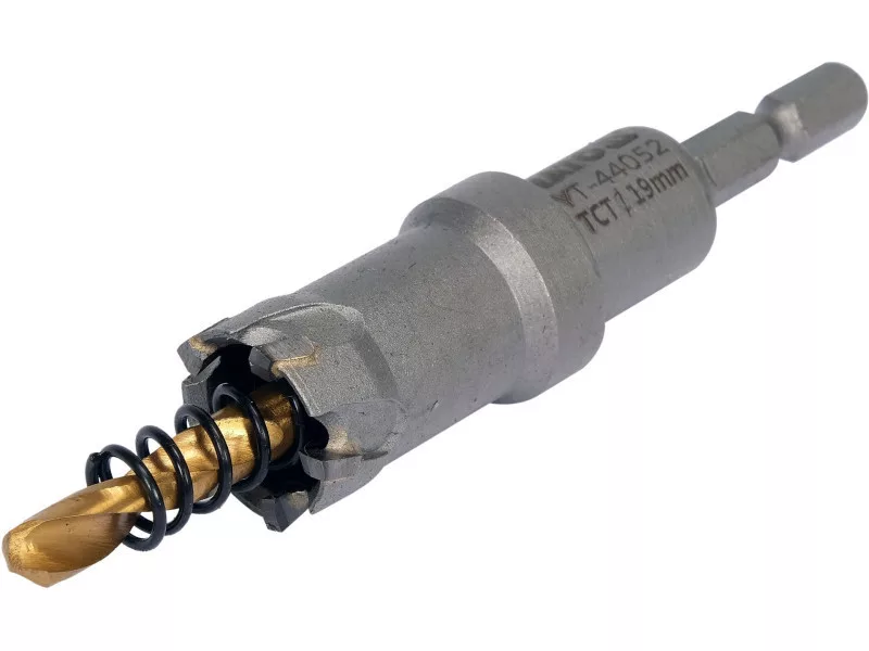 Diameter: 19MM, CUTTING DEPTH: 25MM, TOTAL LENGTH: 103MM, Sintered Carbide YG10X, CORE MATERIAL: CARBON STEEL, PILOT DRILL MATERIAL: HSS4341 TIN, SIZE: 6MM, HEX-6.3MM HANDLE,  1 PACK. ALLEN WRENCH, 1PC. EXHAUSTING SPRING, APPLICATION: CONSTRUCTIVE STEEL (HEA, HEB TOWERS, ELECTRICAL DISTRIBUTORS, GAS BOXES), STAINLESS STEEL, Plastic (ABS, PE, PVC, ALSO reinforced with glass fiber) .