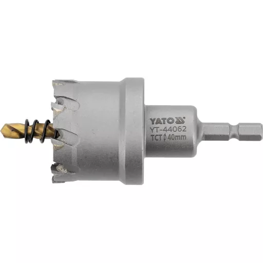 Diameter: 40MM, CUTTING DEPTH: 25MM, TOTAL LENGTH: 103MM, Sintered Carbide YG10X, CORE MATERIAL: CARBON STEEL, PILOT DRILL MATERIAL: HSS4341 TIN, SIZE: 6MM, HEX-6.3MM HANDLE, 1 PACK. ALLEN WRENCH, 1PC. EXHAUSTING SPRING, APPLICATION: CONSTRUCTIVE STEEL (HEA, HEB TOWERS, ELECTRICAL DISTRIBUTORS, GAS BOXES), STAINLESS STEEL, Plastic (ABS, PE, PVC, ALSO reinforced with glass fiber) .