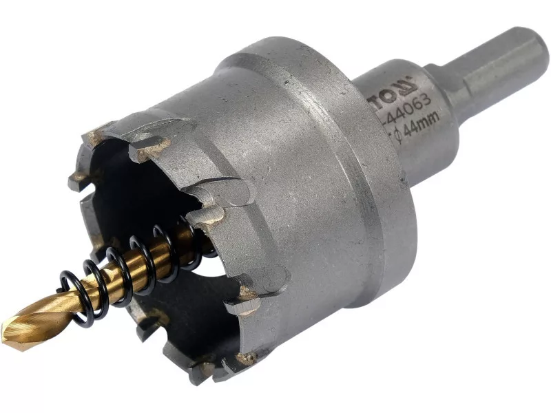 Diameter: 44MM, CUTTING DEPTH: 25MM, TOTAL LENGTH: 103MM, Sintered Carbide YG10X, CORE MATERIAL: CARBON STEEL, PILOT DRILL MATERIAL: HSS4341 TIN, SIZE: 6MM, HEX-10MM HANDLE,  1 PACK. ALLEN WRENCH, 1PC. EXHAUSTING SPRING, APPLICATION: CONSTRUCTIVE STEEL (HEA, HEB TOWERS, ELECTRICAL DISTRIBUTORS, GAS BOXES), STAINLESS STEEL, Plastic (ABS, PE, PVC, ALSO reinforced with glass fiber) .
