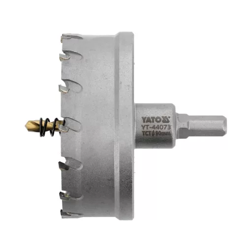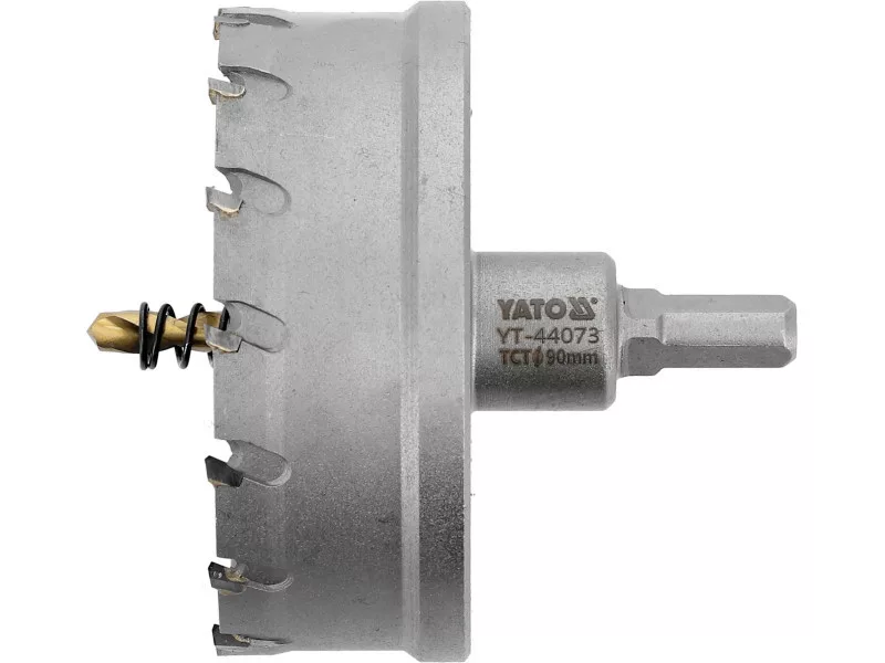 Diameter: 90MM, CUTTING DEPTH: 25MM, TOTAL LENGTH: 103MM, Sintered Carbide YG10X, CORE MATERIAL: CARBON STEEL, PILOT DRILL MATERIAL: HSS4341 TIN, SIZE: 6MM, HEX-10MM HANDLE, 1 PACK. ALLEN WRENCH, 1PC. EXHAUSTING SPRING, APPLICATION: CONSTRUCTIVE STEEL (HEA, HEB TOWERS, ELECTRICAL DISTRIBUTORS, GAS BOXES), STAINLESS STEEL, Plastic (ABS, PE, PVC, ALSO reinforced with glass fiber) .