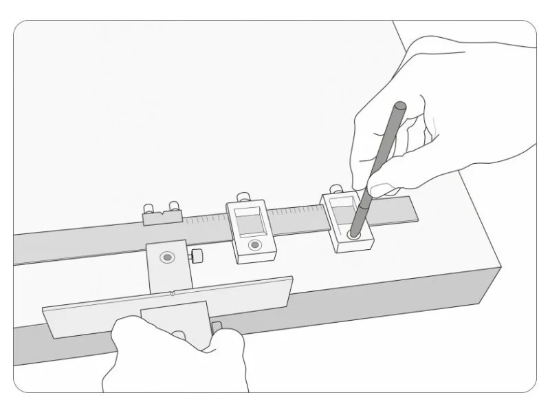 Template, guide for determining drilling points. The main arm made of aluminum, has a permanently applied millimeter scale up to 250 mm and a movable, blocking parallel limiter. A movable, steel strip is installed in the upper part, on which three sliding markers are placed for the appointed designation of drilling points. The template is intended for precise designation of points where we will drill the holes. At the same time, we can designate four holes at different distances from each other and block the settings to maintain the repeatability of the choice., I.e. select the same configuration, e.g. on a different material. The template makes it easier to rub on various materials, e.g. wood, metal, plastics, etc., depend depending on the needs of the distance between the markers and block them with blocking screws. Then set the parallel strip determining the distance from the edge of the workpiece. Using the marker, pencil or point, mark the drilling site on the material.