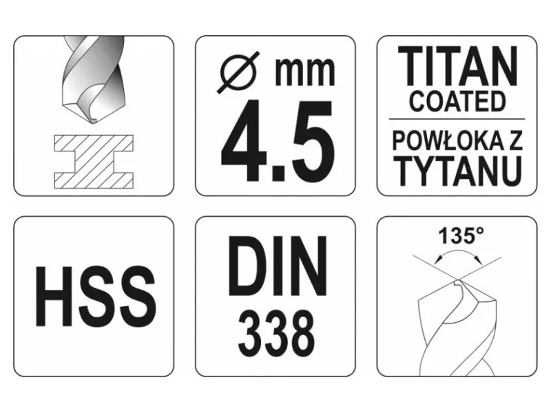 A ground drill with aggressive blade geometry. Thanks to the titanium nitride coating, it drains heat very efficiently and does not move when working in hard steel species. The blade attack angle of 135 ° allows drilling even without prior use of a point. Made according to the DIN 338 standard for professional applications in industry. A drill with a cylindrical handle designed for standard self -stacking drilling holders and key. High pressure resistance also allows the use of column and magnetic drills. Drilling in high -quality steel, including stainless, structural and cold rolled. Drilling without the need for scoring, thanks to the aggressive geometry of the blade. Quick heat dissipation allows you to work without the use of a cooling factor, without causing a drill burning.