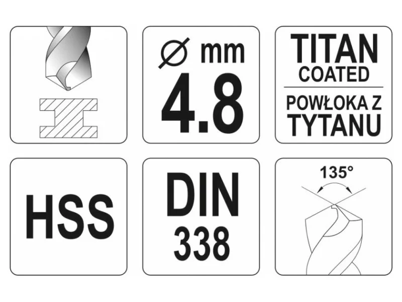 A ground drill with aggressive blade geometry. Thanks to the titanium nitride coating, it drains heat very efficiently and does not move when working in hard steel species. The blade attack angle of 135 ° allows drilling even without prior use of a point. Made according to the DIN 338 standard for professional applications in industry. A drill with a cylindrical handle designed for standard self -stacking drilling holders and key. High pressure resistance also allows the use of column and magnetic drills.