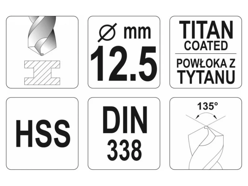 A ground drill with aggressive blade geometry. Thanks to the titanium nitride coating, it drains heat very efficiently and does not move when working in hard steel species. The blade attack angle of 135 ° allows drilling even without prior use of a point. Made according to the DIN 338 standard for professional applications in industry. A drill with a cylindrical handle designed for standard self -stacking drilling holders and key. High pressure resistance also allows the use of column and magnetic drills.