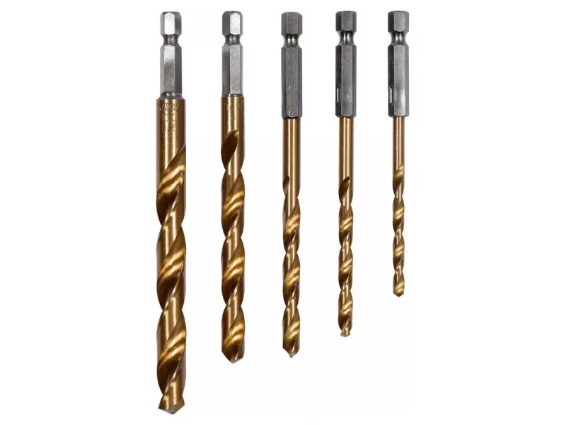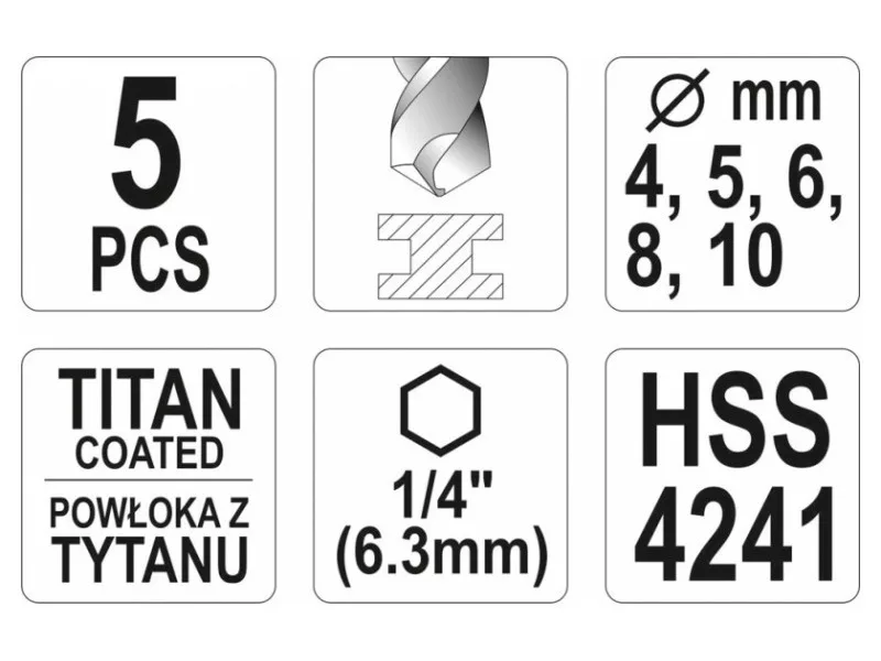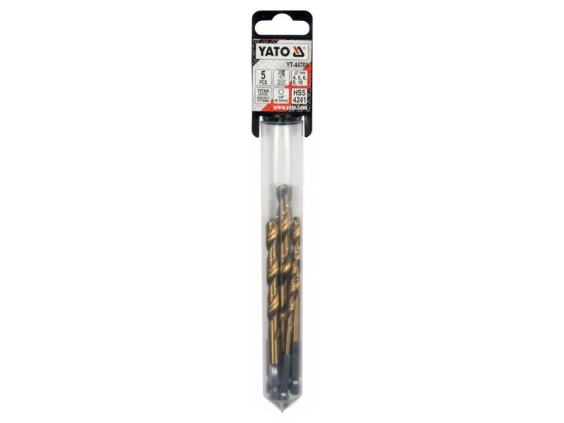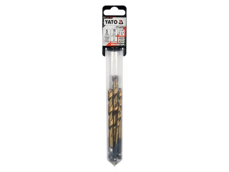 A set of drills with a titanium metal coating with a YATO YT-44700 hexagon handle. Made of high-speed HSS steel, covered with a titanium coating. Split Point allows drilling without prior scoring. Drot drill edges. 135 degrees angle. They quickly escape heat when drilling in hard steel species, not causing drilling. Dyeded for professional applications, drilling in high -quality stainless, structural, and cold rolled steel.