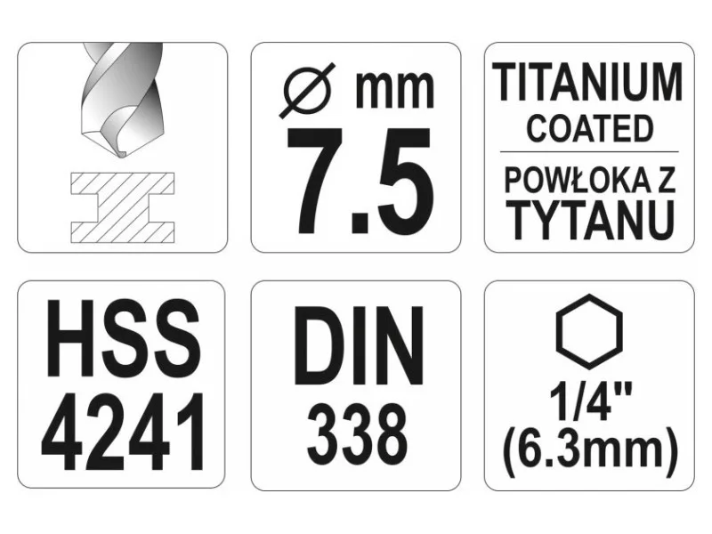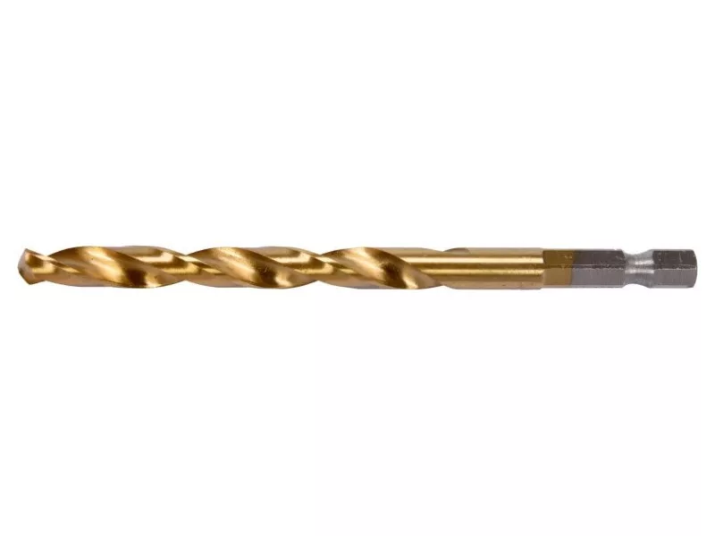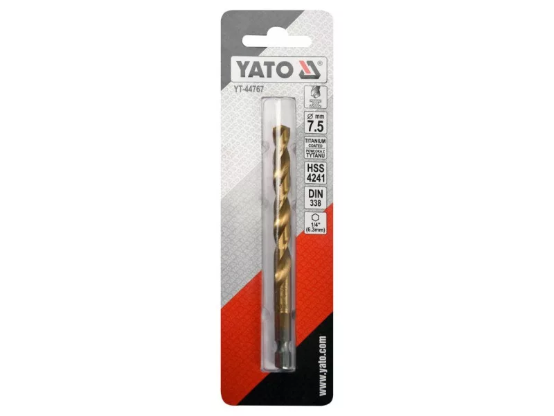 Titanium-coated metal drill bit with hexagonal shank by YATO YT-44767.Made of high-speed HSS steel, titanium-coated. Split point allows drilling without prior scoring. The edges of the drill bit are ground. Point angle of 135 degrees. Quickly dissipate heat when drilling in hard steels without burning the drill bits. Dedicated to professional applications, drilling in high-grade stainless steel, structural steel, and cold-rolled steel.