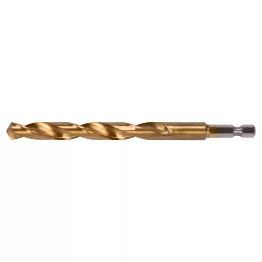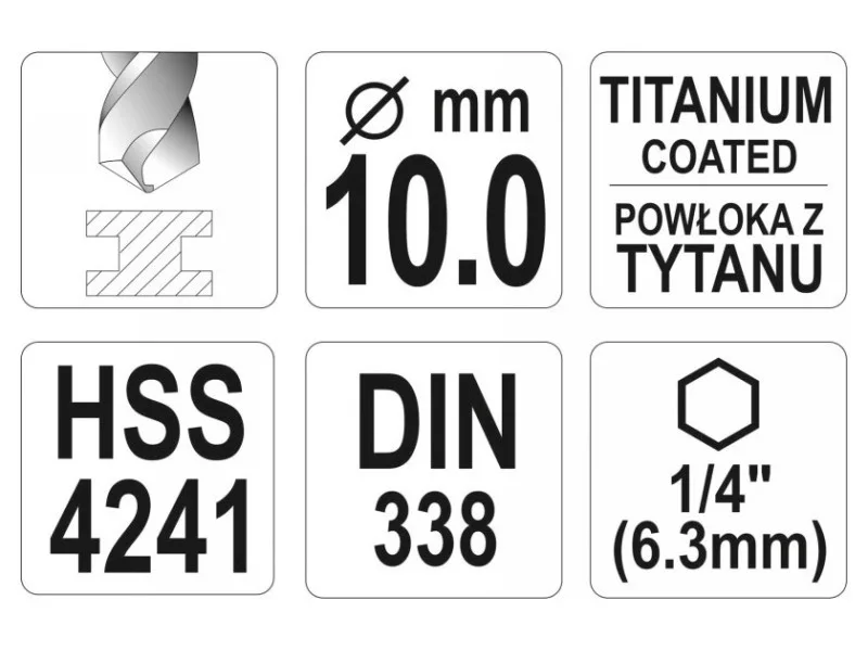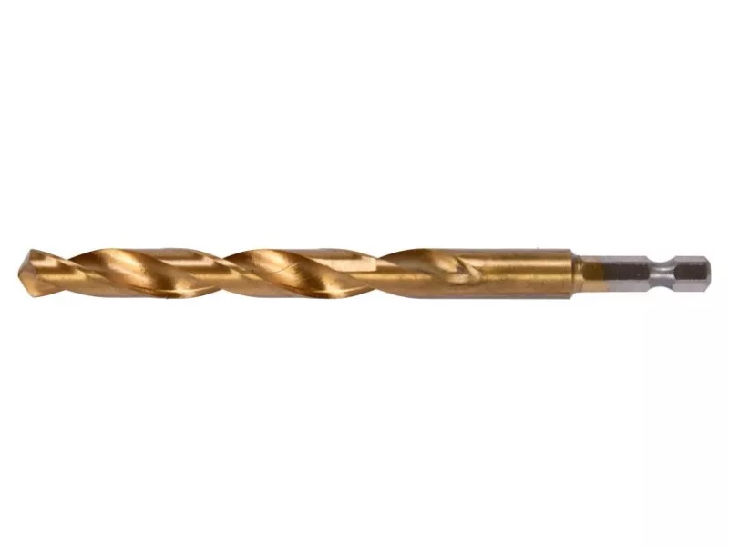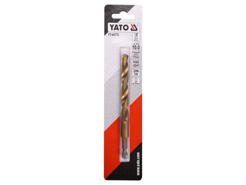Titanium-coated metal drill bit with hexagonal shank by YATO YT-44772.Made of high-speed HSS steel, titanium-coated. Split point allows drilling without prior scoring. The edges of the drill bit are ground. Point angle of 135 degrees. Quickly dissipate heat when drilling in hard steels without burning the drill bits. Dedicated to professional applications, drilling in high-grade stainless steel, structural steel, and cold-rolled steel.