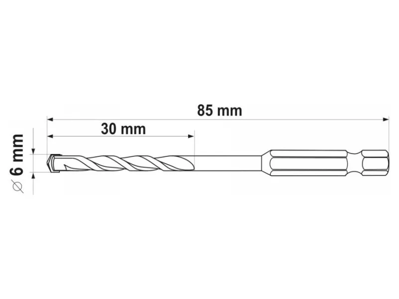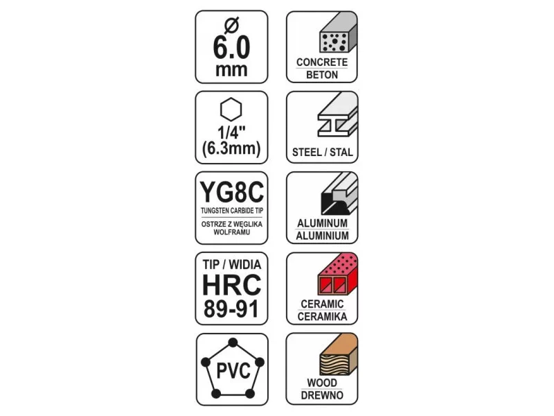 Universal drill from Yato YT-44783. Universal drill, which thanks to the special spiral design allows drilling in almost all materials - metal, concrete, aluminum, ceramics, wood and plastic. • Wolfram carbide blade of YG6X with a hardness of 89–91 HRC • Drill body with a hardness of 42–45 HRC • The spiral geometry accelerates the removal of spoil • efficient, durable and resistant to damage and racing • HEX 1/4ʺ hexagonal handle (6.3 mm) allows fastening for battery screws and stroke keys.