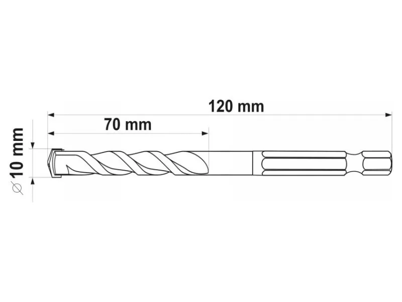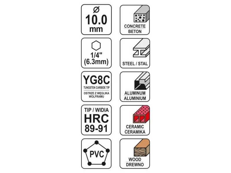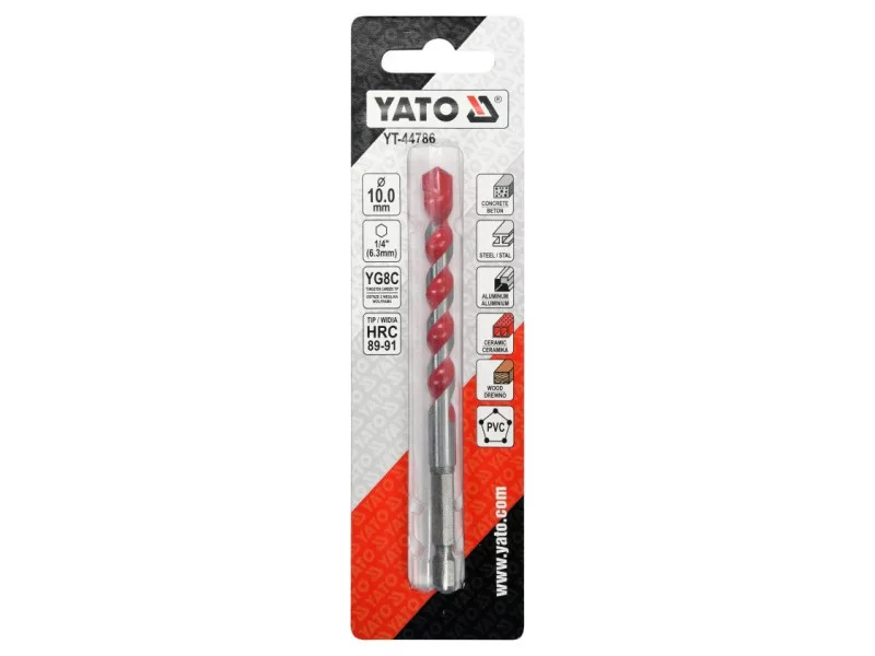 Universal drill from Yato YT-44786. Universal drill, which thanks to the special spiral design allows drilling in almost all materials - metal, concrete, aluminum, ceramics, wood and plastic. • Wolfram carbide blade of YG6X with a hardness of 89–91 HRC • Drill body with a hardness of 42–45 HRC • The spiral geometry accelerates the removal of spoil • efficient, durable and resistant to damage and racing • HEX 1/4ʺ hexagonal handle (6.3 mm) allows fastening for battery screws and stroke keys.