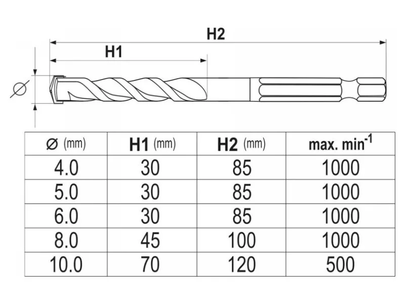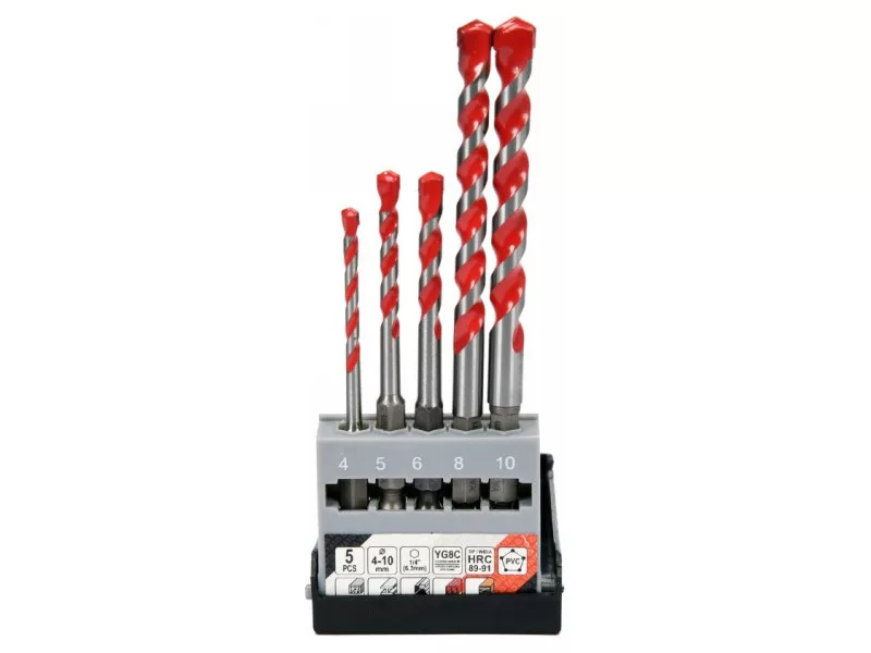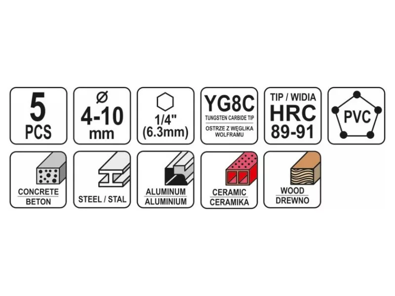 A set of universal drills from Yato YT-44789. Universal drills, which thanks to the special spiral design allow drilling in almost all materials - metal, concrete, aluminum, ceramics, wood and plastic. • Wolfram carbide blade of YG6X with a hardness of 89–91 HRC • Drill body with a hardness of 42–45 HRC • The spiral geometry accelerates the removal of spoil • efficient, durable and resistant to damage and racing • HEX 1/4ʺ hexagonal handle (6.3 mm) allows fastening for battery screws and stroke keys. Drills: 4, 5, 6, 8, 10mm