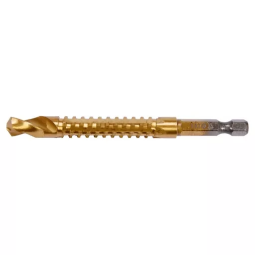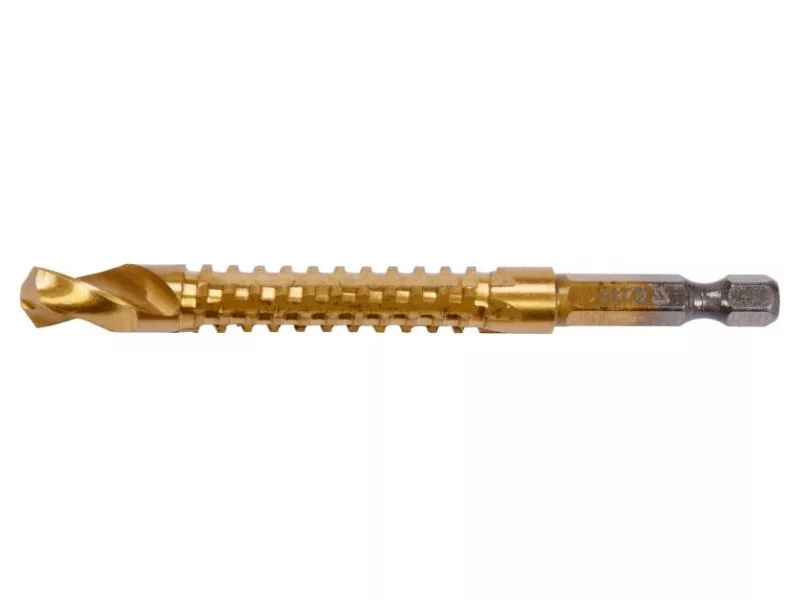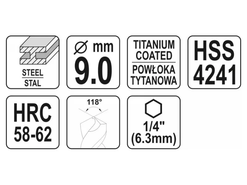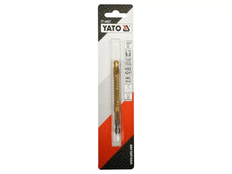 9 mm metal milling drill from Yato YT-44827. Milling drill made of high quality high -speed HSS 4241 titan -covered titanium. Intended for professional, industrial applications. STAL HSS provides several times faster drilling in stainless, acid -resistant and structural steel. The "Split Point" cross blade with an apical angle of 118 ° allows drilling without prior scoring, also with large diameters of drilling, guaranteeing perfect centering. They enable drilling in every direction and at any angle, perfect for drilling holes, including for door locks. The ground surface ensures excellent drilling precision. Made of one piece of steel, making them very strong and durable. Hard coating 58–62 HRC coated with titanium nitride maintains resistance to damage and stretching, maintaining the geometry of drilling • Lower drilling temperature and rapid heat dissipation do not cause melting galvanized and subsequent corrosion of drills • The smaller friction factor limits the adhesion to the chips and filings. 1/4 ″ hexagon handle (6.3 mm).