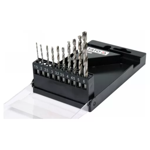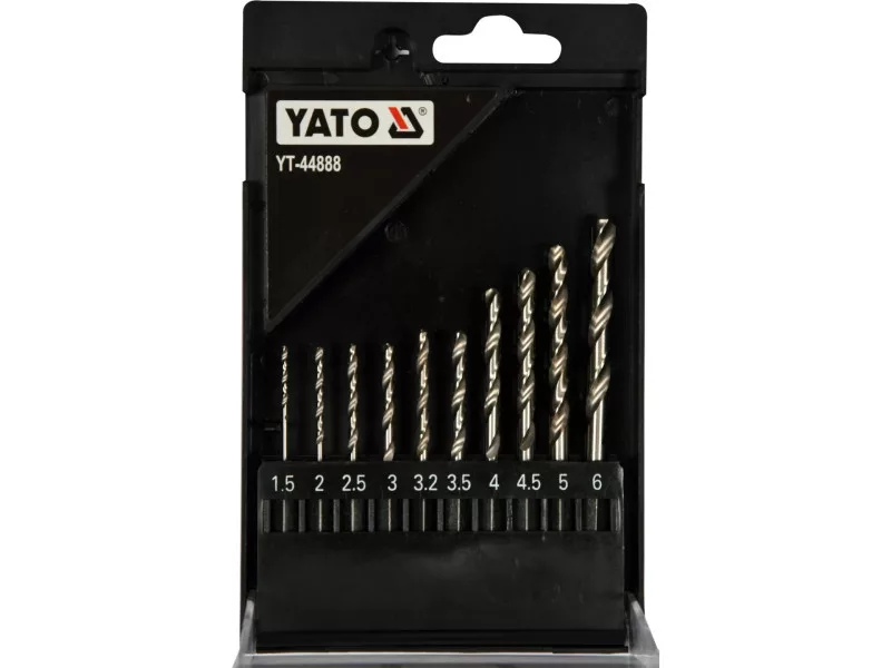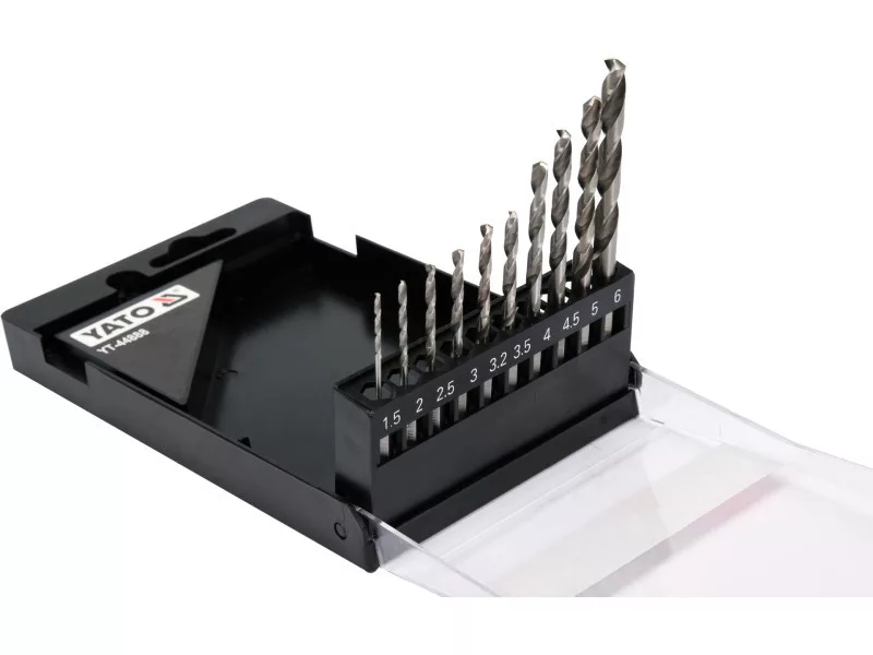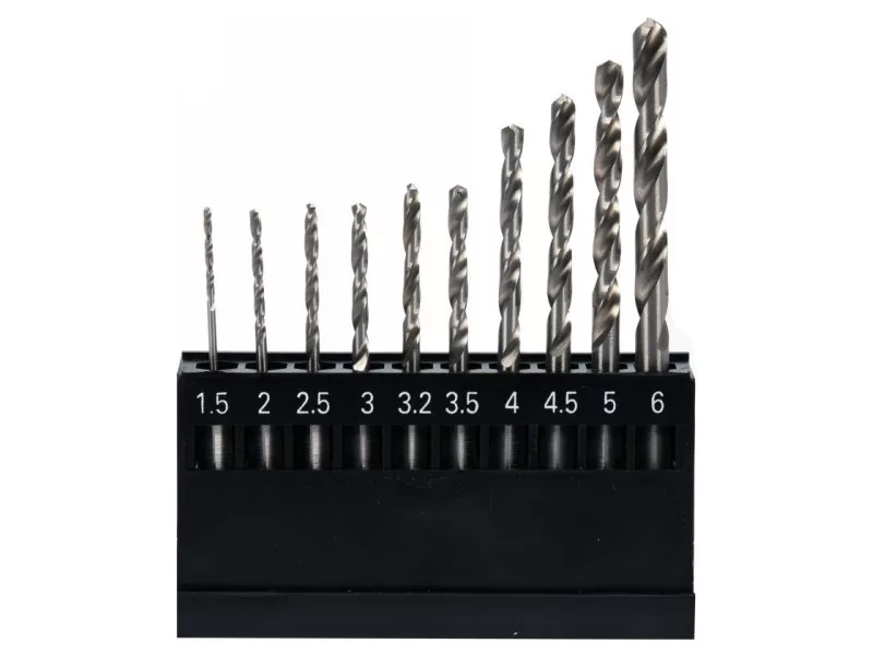 The set includes 10 HSS drill bits with diameters: 1.5, 2.0, 2.5, 3.0, 3.2, 3.5, 4.0, 4.5, 5.0, 6.0 mm, packed in a handy case