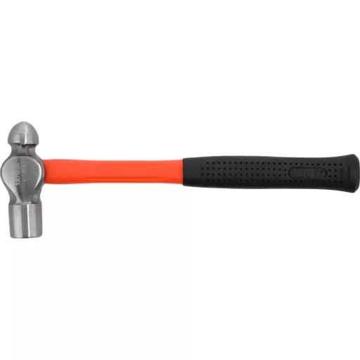 A 450 g (16 oz) sheet metal hammer with a fiberglass handle.