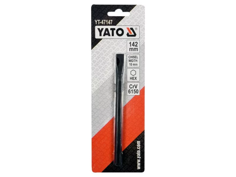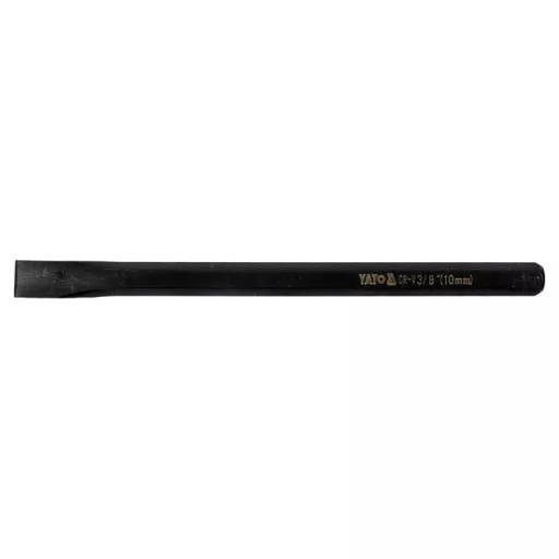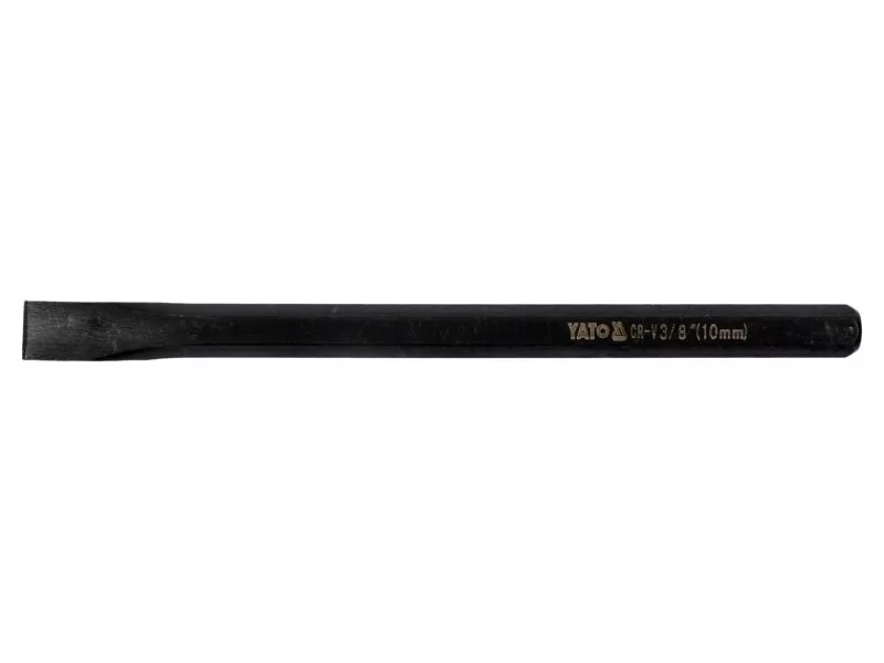 Flattened working part with sharpened, milled edge , the chisel leaves a mark on the material when struck with a hammer, overall length 142 mm, width 10 mm, handle with 9.4 mm hexagonal profile. Made of CrV6150 steel fully blackened. Locksmith chisel for metal work, chiselling, notching, marking, cutting off bolts or rivets and other similar applications.
