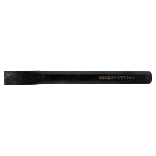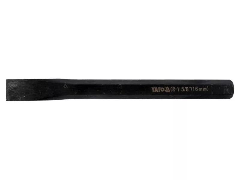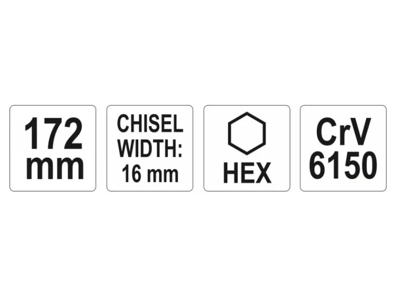 Flattened working part with sharpened, milled edge , the chisel leaves a mark on the material when struck with a hammer, overall length 172 mm, width 16 mm, handle with 9.4 mm hexagonal profile. Made of CrV6150 steel, fully blackened. Locksmith chisel for metal work, chiselling, notching, marking, cutting off bolts or rivets and other similar applications.