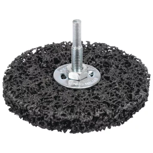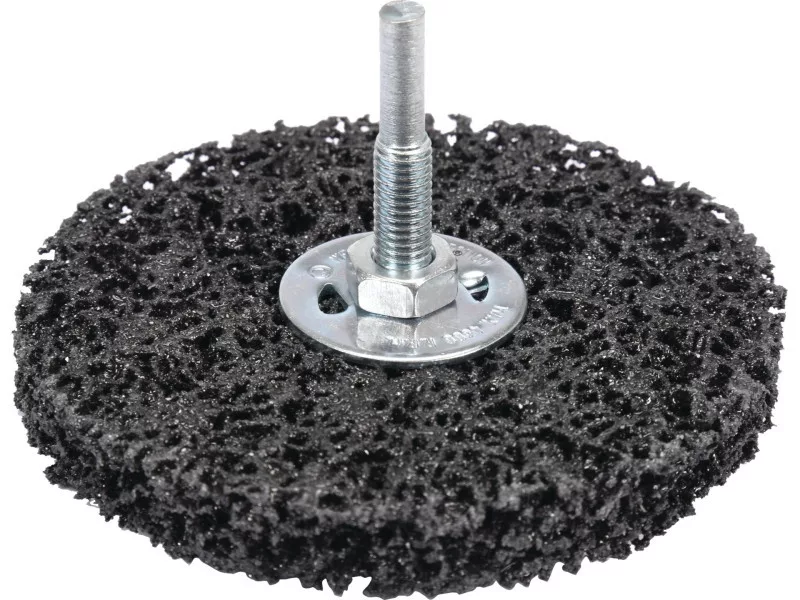 Rotary brush designed for removing rust and paint coatings from flat surfaces and cleaning tools.
