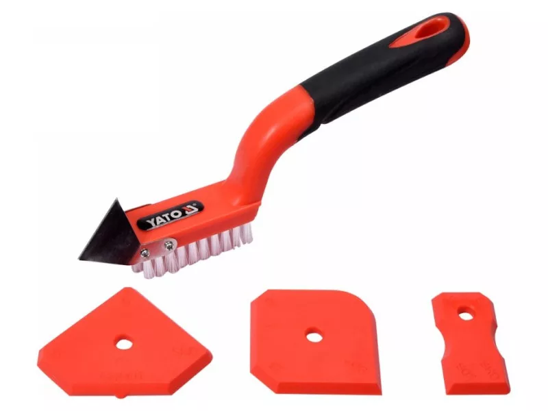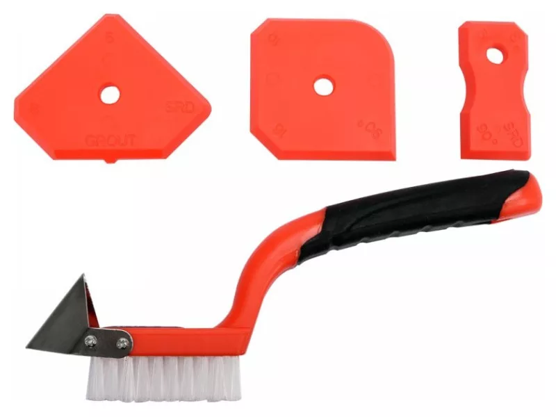 - three flexible spatulas with profiled edges and corners, corresponding to different grout widths