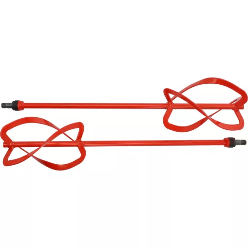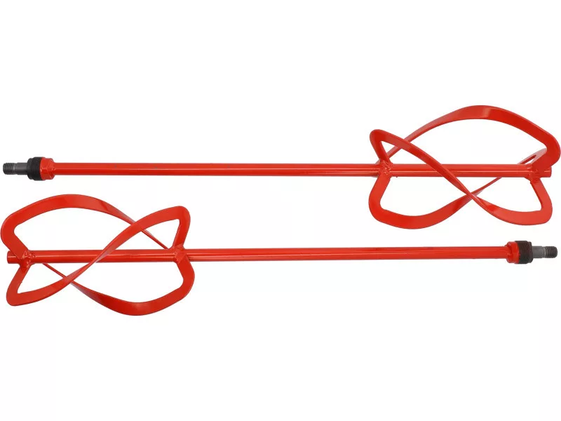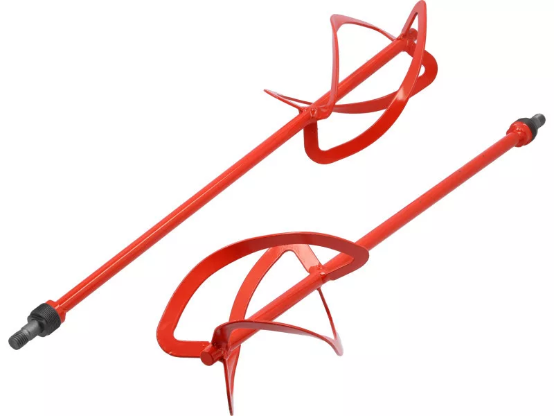 Set of 2 spiral mixers - left and right - for the YT-82609 twin spindle mixer. Designed for mixing gypsum and cement mortars, adhesives, paints, epoxy resins. The design of the tools ensures thorough mixing of the mix due to the movement that lifts the mortar from the bottom of the caster to the surface during mixing.