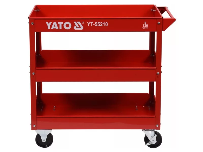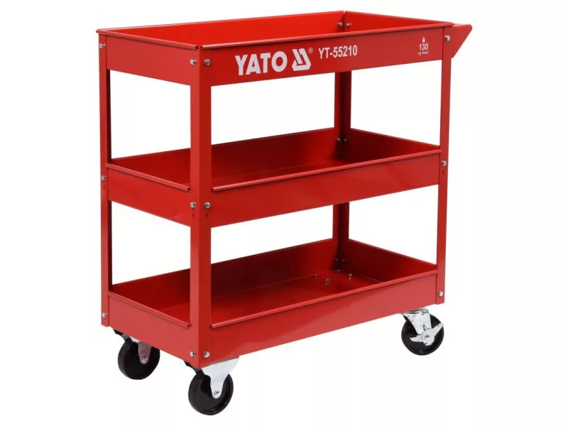 Three -level workshop stroller. Load capacity 130 kg. Practical, three -level workshop trolley with a load capacity of 130 kg. Thanks to it, you can always have the tools you need at hand. • load capacity: 130 kg • 3 comfortable shelves • durable, made of steel • has 4 wheels, including 2 torsional with a brake, the package contains a three -level workshop stroller.