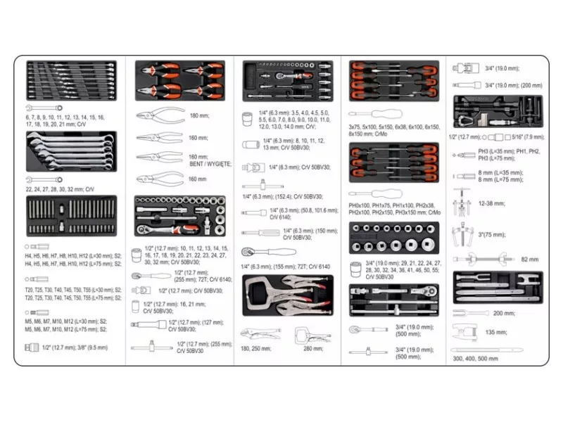 INSERT 1: Flat-end wrenches YT-0335~YT-0350 (6, 7, 8, 9, 10, 11, 12, 13, 14, 15, 16, 17, 18, 19, 20, 21 mm) INSERT 2: YT-0351~YT-0360 open-end wrenches (22, 24, 27, 28, 30, 32 mm) REFILL 3: ADAPTOR 1/2" & 3/8"; HEX bits, 30 MM (H4, 5, 6, 7, 8, 10, 12) & 75 MM (H4, 5, 6, 7, 8, 10,12) / TORX bits, 30 MM (T20, T25, T30, T40, T45, T50, T55) &. 75 MM (T20,T25, T30, T40, T45, T50, T55) / SPLINE Bits, 30 MM (M5, 6, 8, 10, 12) &75 MM (M5, 6, 8, 10, 12) INSERT 4: 1/2" hex sockets YT-1203~YT-1243 (10, 11, 12, 13, 14, 15, 16, 17, 18, 19, 20, 21, 22, 23, 24, 27, 30, 32 MM), ratchet YT-0732 1/2", CRV 6140, 72T / YT-1247 extension 1/2" 127 MM / YT-1252 cardan joint 1/2", YT-1253~YT-1254 candle socket 1/2", 16 MM, 21 MM, YT-1243 T-handle 1/2" 255 MM INSERT 5: 1/4" hex sockets YT-1401~YT-1412 (3.5; 4; 4.5; 5; 5.5; 6; 7; 8; 9; 10; 11; 12; 13; 14 mm), YT-1419~YT-1424 (8, 10, 11, 12, 13 MM), 1/4" extension, YT-1429 (50.8 MM) & YT-1431 (101.6 MM), YT-1437 1/4" cardan joint, YT-1425 1/4" T-knob, 152.4 MM, YT-0730 1/4" ratchet, 72TH, CRV6140 INSERT 6: YT-1941 universal pliers CR-V, 180 MM / YT-1943 elongated straight pliers, CR-V, 160 MM, YT-1945 elongated curved pliers, CRV, 160 MM/ YT-1947 side cutter pliers, CRV, 160 MM INSERT 7: flathead screwdrivers YT-2760 3x75 MM; YT-2763 5x100 MM, YT-2764 5x150 MM, YT-2765 6x38 MM, YT-2766 6x100 MM, YT-2767 6x150 MM, YT-2769 8x150 MM INSERT 8: Phillips screwdrivers YT-2771 PH0x100 MM; YT-2772 PH1x75 MM, YT-2773 PH1x100 MM, YT-2775 PH2x38 MM, YT-2776 PH2x100 MM, YT-2777 PH2x150 MM, YT-2779 PH3X150 MM INSERT 9: crimping pliers YT-2452, YT-2453, YT-2468 INSET 10: 3/4" hex sockets 19 MM (YT-1301); 21 MM (YT-1302); 22 MM (YT-1303);24 MM (YT-1305); 27 MM (YT-1308); 28 MM (YT-1309); 30 MM (YT-1311); 32 MM (YT-1312); 34 MM (YT-1314); 36 MM (YT-1316); 41 MM (YT-1318); 46 MM (YT-1322); 50 MM (YT-1324); 55 MM (YT-1328) FIT 11: ratchet 3/4 "X500mm (YT-1360); extension 3/4 "x200 MM (YT-1341); cardan joint 3/4" (YT-1352); T-handle 3/4 "x500 MM (YT-1350) INSERT 12: bearing puller (YT-2510); impact screwdriver (YT-2802); spring pullers (YT-2544); double-arm puller (YT-2515) CONTRIBUTOR 13: puller for steering rods (YT-0615); puller for ball studs (YT-0612); tire bucket 500 MM (YT-0809); 400 MM (YT-0808);300 MM (YT-0807)