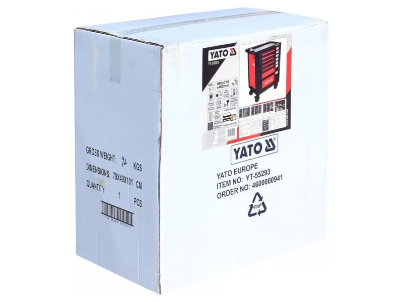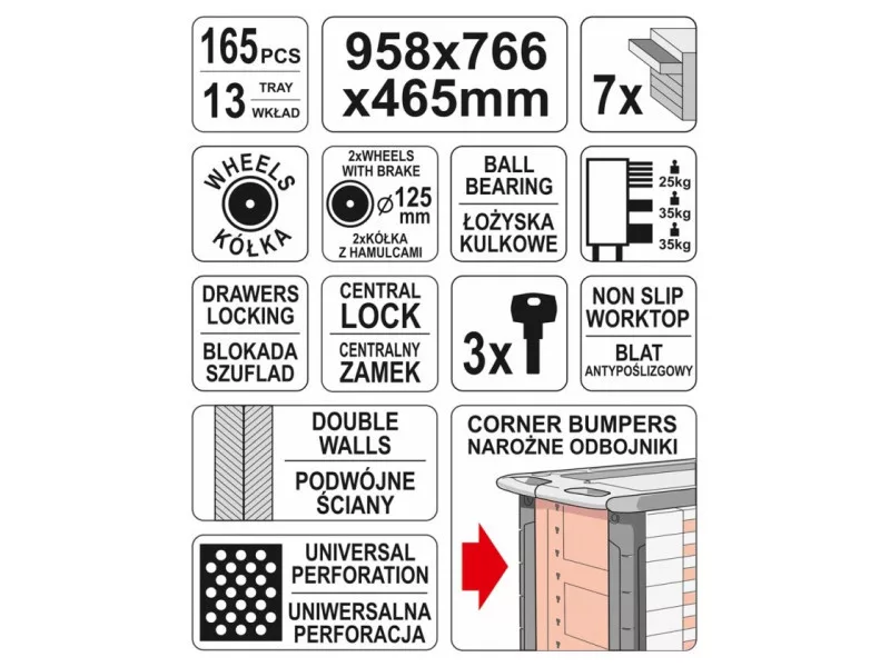 YATO brand tool cabinet. It is equipped with 7 drawers on ball bearing slides. 5 górne drawers contain 165 carefully selected tools. Profiles are made of underwater steel sheet - universal perforation allows retrofitting the cabinet with additional items. Central locking and individual locking of each drawer.