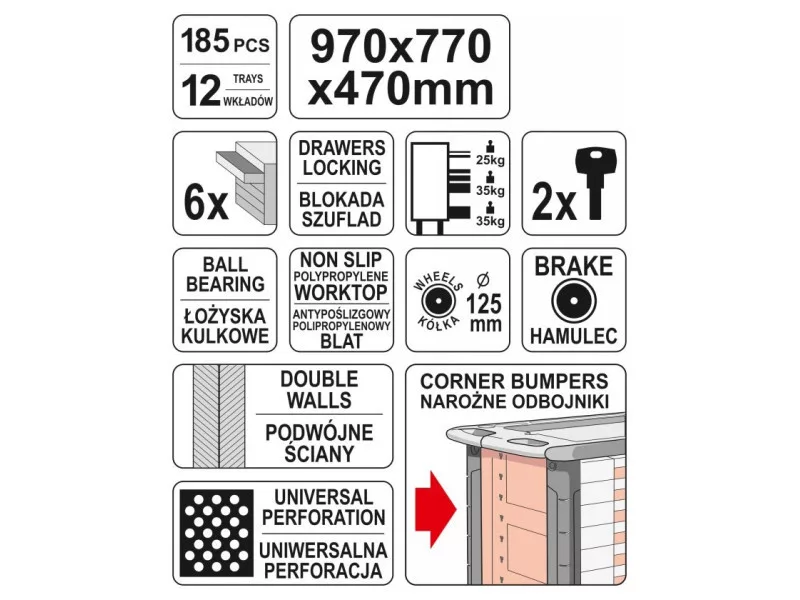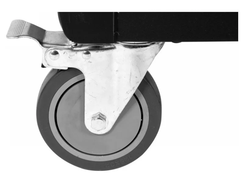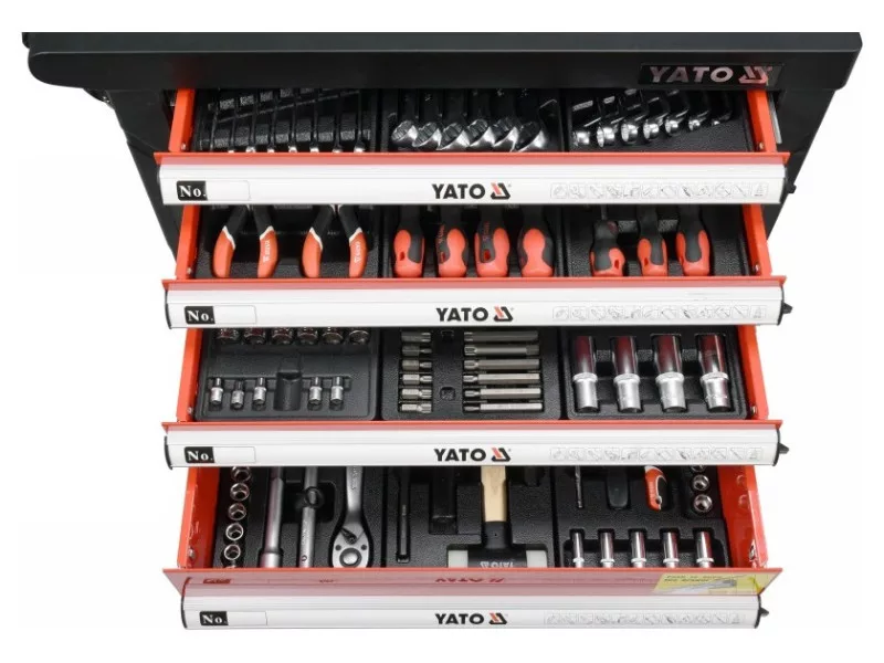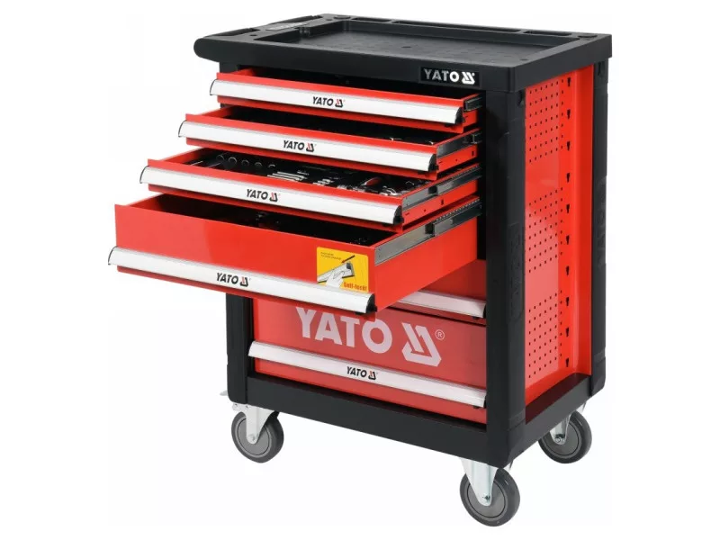 YATO tool service cabinet. It has 6 drawers with a locking mechanism, that mounted on ball bearing slides - 3 upper drawers have a load capacity of 25 kg, and 3 lower drawers have a load capacity of 35 kg. The cabinet has been equipped with handy handle and durable, rubber wheels, so moving it is not a problem at all.